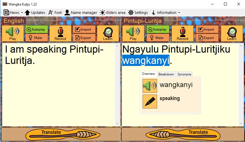 Realtime translation from English to Pintupi-LuritjaRealtime translation from Pintupi-Luritja to EnglishPintupi-Luritja text-to-speech Pintupi-Luritja speech recognition Pintupi-Luritja word analysisMachine learning capabilitiesReads the weather in Pintupi-LuritjaClick here to see the